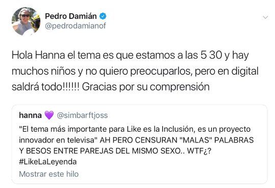 Ante la evidente muestra de censura, el público comenzó a cuestionar a la producción de la telenovela, por lo que Pedro Damián, salió a responder en redes sociales el por qué de su decisión, que terminó por reafirmar la LGBTfobia latente en la televisora, al decir que a la hora de transmisión del programa hay muchos niños y no quería preocuparlos.