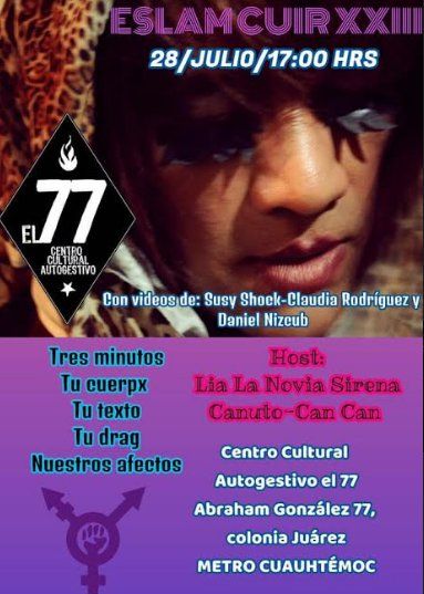 CIUDAD DE MÉXICO.- El próximo domingo 28 de julio a las 17:00 h se realizará en el Centro Cultural Autogestivo El 77 la vigésima tercera edición del Eslam de Poesía Cuir, el cual abre su convocatoria a miembros de la comunidad LGBTTTIQ+ a leer sus textos, realizar sus performance y usar por tres minutos el escenario para competir por ser el ganador de este edición, el cual competirá por representar a la liga Queer el próximo año en el Campeonato Nacional de Poesía.