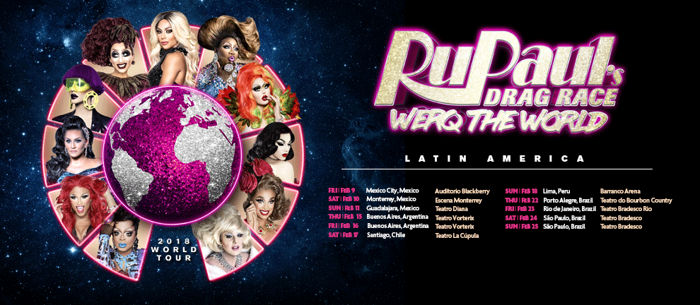 Al terminar sus presentaciones en México y América del Sur, la gira «WERQ THE WORLD» seguirá con fechas en Europa, después Norteamérica, Asia y Australia. Los boletos para «RUPAUL’S DRAG RACE 2018 WERQ THE WORLD» ya están a la venta en www.werqtheworld.com, no te lo pierdas!