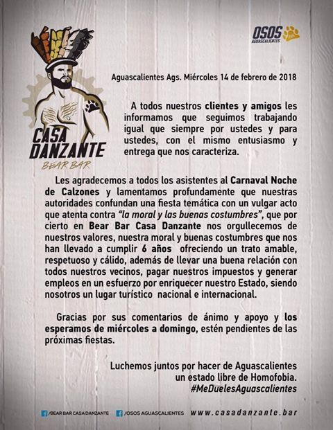 «En Bear Bar Casa Danzante nos enorgullecemos de nuestros valores, nuestra moral y buenas costumbres que nos han llevado a cumplir seis años ofreciendo un trato amable, respetuoso y cálido, además de llevar una buena relación con todos nuestros vecinos, pagar nuestros impuestos y generar empleos en un esfuerzo por enriquecer nuestro Estado, siendo nosotros un lugar turísticos nacional e internacional».