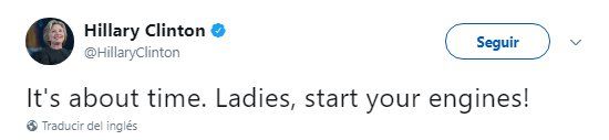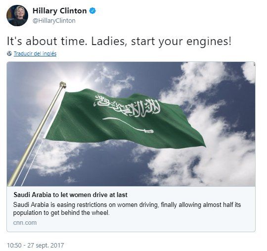 «Ya es hora, Señoritas, enciendan sus motores», dice el tuit. Sin embargo, la realidad es que la ex primera dama de Estados Unidos, estaba haciendo referencia a las políticas en Arabia Saudita que se endurecerán para evitar que las mujeres conduzcan automóviles.
